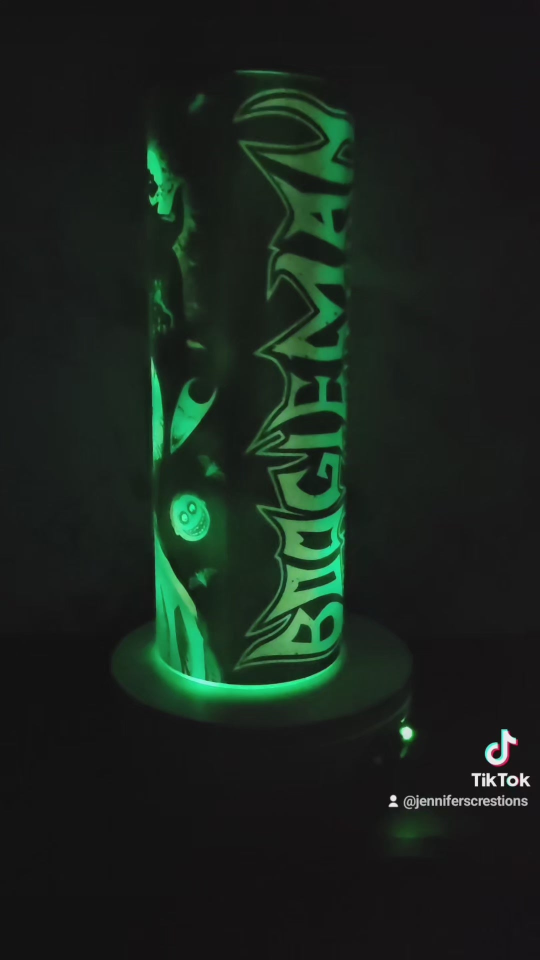 Glows in green comes with a push on lid, a straw and a gift box.